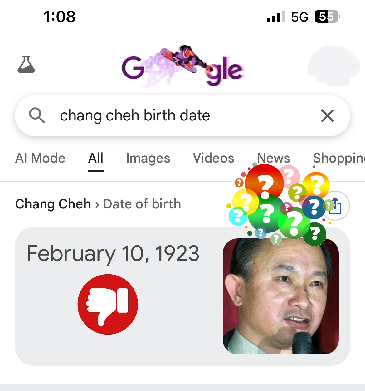 Analyzing the movie maestro and his films for the last 25 years, I've never located a viable source. Just regurgitated internet chatter. One of the earliest Shaw Brothers related websites was "Chang Cheh: Godfather of the Kung Fu Film" (2002-2008). They had the 2/10/23 date listed, but there's no mention of a source or where they may have gotten this. Perhaps an old print article would be my best guess. Google "chang cheh birth date" and it will produce the February 10, 1923 date with a nice photo of John Woo! Yes, Woo may have been Chang's prodigy at the Shaw Studio, in the early seventies, but why is his photo used and not Chang?